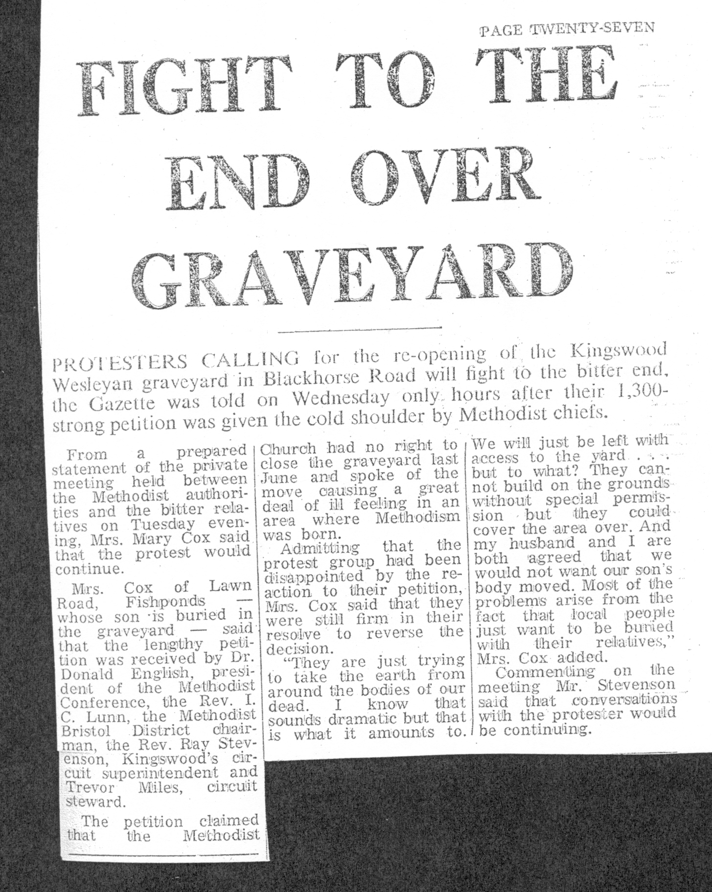- 20 Oct 1978, Bristol Journal (mother's heartbreak over burial ground closure)